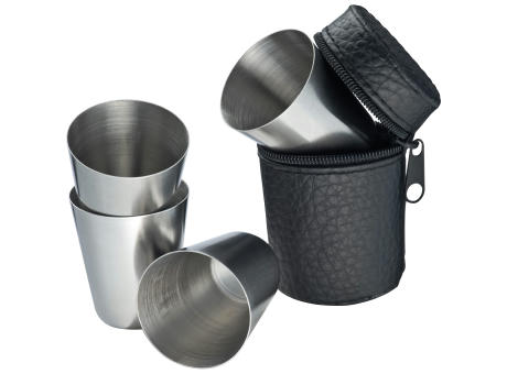 Set mit vier Schnapspinnchen (je 30ml) aus Edelstahl in einem praktischen Etui aus Kunstleder. Ihre Werbung lasern wir auf die Becher.