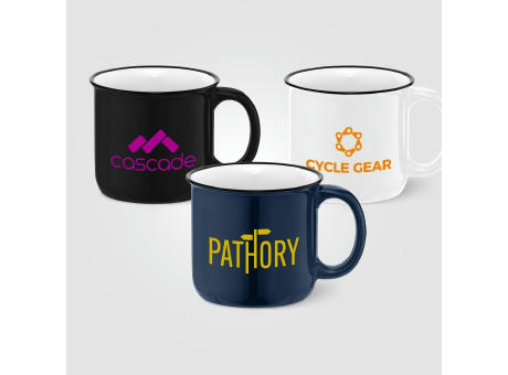 Unsere Adventure - 445 ml Campfire Keramiktasse hat innen und außen eine Hochglanzoberfläche, die den Look aufwertet! Die schwarze Umrandung dieser Tasse lässt die klassischen Farben Schwarz, Marineblau und Weiß noch mehr zur Geltung kommen. Bringen Sie Firmenlogos, Werbebotschaften und vieles mehr auf diesem hochwertigen Trinkgefäß an. Gestalten Sie es mit Ihrem 1-farbigen Siebdrucklogo. Es ist sowohl für die Mikrowelle als auch für die Spülmaschine geeignet.