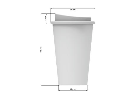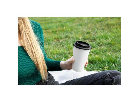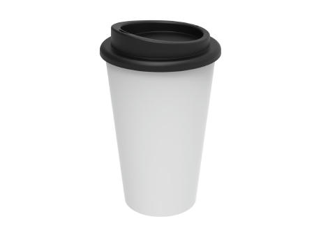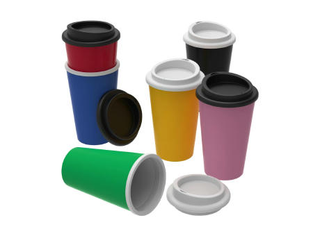 Für den Kaffee unterwegs. Praktischer To-Go-Becher aus doppelwandigem Kunststoff inkl. Deckel mit Trinköffnung. Der Deckel ist verschraubbar und hält somit besonders gut auf dem Becher. Füllmenge: 0,35 Liter.