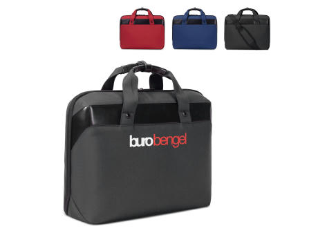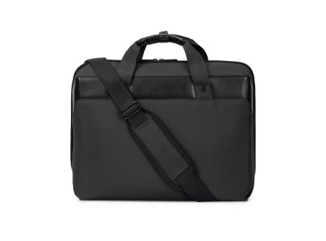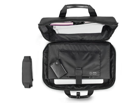 Stilvolle und robuste Notebook-Umhängetasche aus R-PET. Das Hauptfach enthält eine gepolsterte Tasche für ein Notebook (bis zu 15,6”) und eine Etui für ein Tablet-PC (bis zu 11”). Der optionale Schultergurt ist verstellbar und extra breit für zusätzlichen Tragekomfort. Die gepolsterte Rückwand verfügt außerdem über einen Gepäckgurt, mit dem sie an einen Koffer angebracht werden kann.