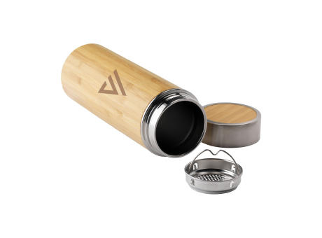 Doppelwandige, vakuumisolierte, auslaufsichere, Thermoflasche/ Thermobecher aus Edelstahl mit Bambus-Finish. Inklusive herausnehmbarem Teesieb aus Edelstahl. Spülmaschinengeeignet. Fassungsvermögen 360 ml. Wird einzeln in einem Kraftkarton geliefert.