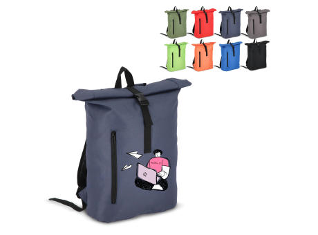 Dieser praktische Rucksack im trendigen Rolltop-Design ist aus recyceltem PET gefertigt. Er verfügt über verstellbare, gepolsterte Schultergurte, einen Griff an der Oberseite und eine Reißverschlusstasche auf der Vorderseite, die sich ideal für kleinere Utensilien eignet.