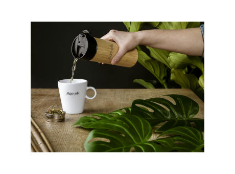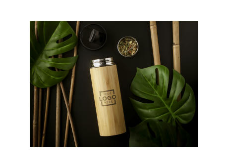 Doppelwandige, vakuumisolierte, auslaufsichere, Thermoflasche/ Thermobecher aus Edelstahl mit Bambus-Finish. Inklusive herausnehmbarem Teesieb aus Edelstahl. Nicht spülmaschinengeeignet. Fassungsvermögen 360 ml. Wird einzeln in einem Kraftkarton geliefert.