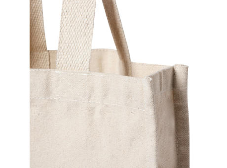 Tasche Tasche aus Baumwolle, natürliches Finish und Extragewicht von 310g/m2. Mit zwei Außentaschen, genäht und mit Zwickel. Extra breite und verstärkte mittlere Griffe (58 x 3,5 cm). Widerstandsfähig bis zu 10 kg Gewicht.
