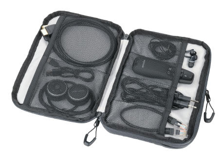 Kabeltasche für Elektronikzubehör, aus recyceltem Meeresplastik, 1 Fach mit 2-Wege Reißverschluss und 6 Netzfächern in 2 verschiedenen Größen, Hauptfach inkl. Geheimfach für mini Tracking-Geräte (z.B. APPLE AirTag®), Einschubfach, Außentasche mit Reißverschluss, Aufdruck: Adapter, Kopfhörer, Ladekabel, 100% rPET, recyceltes Meeresplastik, dunkelgrau