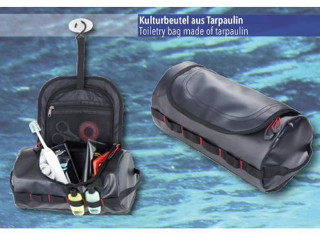 Kulturbeutel für Männer, zum Aufhängen, mit Reißverschluss und Tragegriff, geräumiges Hauptfach inkl. Netzfach mit Reißverschluss und Haken zur Befestigung, abgesetzter Standboden, widerstandsfähiges Material, abwaschbar, 100% Polyester, Tarpaulin (Plane), rot/schwarz