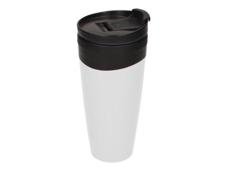 Doppelwandiger Edelstahl/Kunststoff-Thermobecher mit Schraubdeckel und Schiebe-/Klicköffnung. Nicht spülmaschinengeeignet. Fassungsvermögen 400 ml. Verpackt pro Stück.