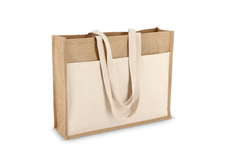 Robuster Jutebeutel mit einer Vordertasche aus Baumwolle und passenden Baumwollgriffen. Hergestellt aus 320 g/m² Material, das für den täglichen Gebrauch geeignet ist. Oeko-Tex® zertifiziert für geprüfte, sichere Textilien. Ideal zum Einkaufen oder für einen Tag am Strand.