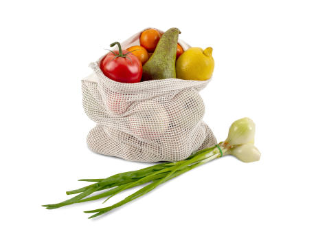 Reduzieren Sie die Anzahl der Plastiktüten im Supermarkt, indem Sie Ihren eigenen Lebensmittelbeutel verwenden. Dieser ungebleichte Baumwollbeutel mit Netz ist sehr gut für Obst und Gemüse geeignet. Verwenden Sie ihn immer wieder und wenn er schmutzig ist, waschen Sie ihn einfach bei niedrigen Temperaturen (könnte einlaufen).